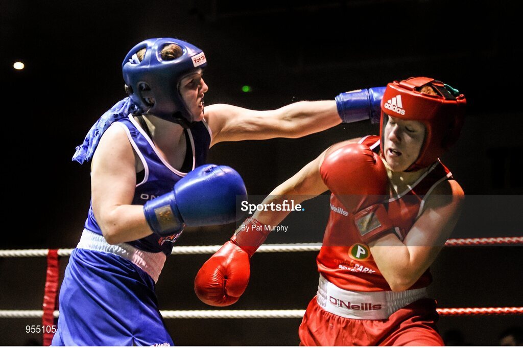 24 January 2015; Claire Grace, Callan, Kilkenny, left, exchanges punches with Christina Desmond, Macroom, Cork, during their 69 kg Welterweight bout. National Elite Boxing Championship Finals, National Stadium, Dublin. Picture credit: Pat Murphy / SPORTSFILE
