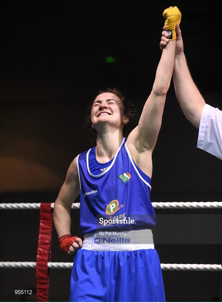 24 January 2015; Kelly Harrington, St Margarets, Dublin, celebrates after winning her 64 kg Light-welterweight bout aainst Kayleigh Murrihy, Kilfenora, Clare. National Elite Boxing Championship Finals, National Stadium, Dublin. Picture credit: Pat Murphy / SPORTSFILE