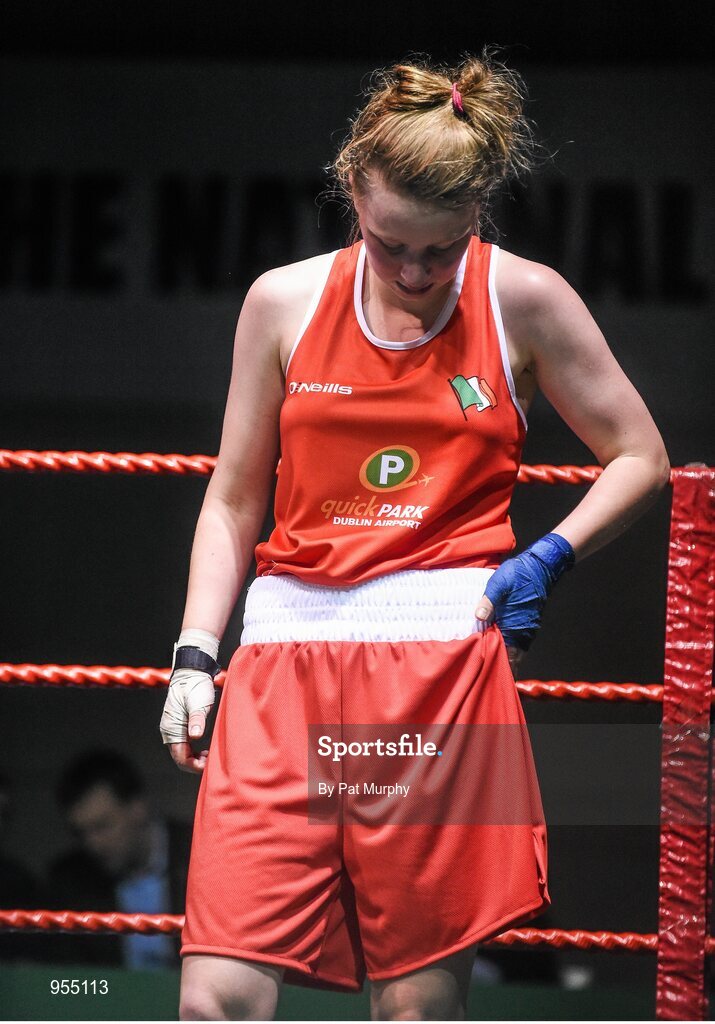 24 January 2015; Kayleigh Murrihy, Kilfenora, Clare, shows her disappointment after 64 kg Light-welterweight bout against Kelly Harrington, St Margarets, Dublin. National Elite Boxing Championship Finals, National Stadium, Dublin. Picture credit: Pat Murphy / SPORTSFILE
