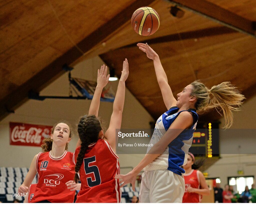 24 January 2015; Hollie Herlihy, Glanmire BC, in action against Anna Brennan, DCU Mercy. Basketball Ireland Women's U18 National Cup Final, DCU Mercy v Glanmire BC, National Basketball Arena, Tallaght, Dublin. Picture credit: Piaras O Midheach / SPORTSFILE