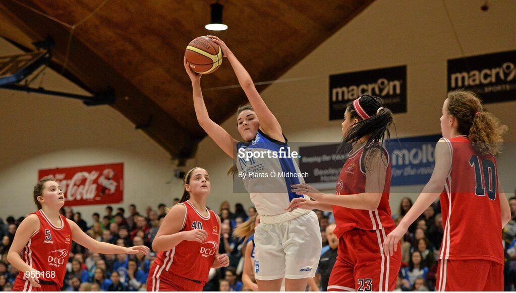 24 January 2015; Sarah Kenny, Glanmire BC, in action against DCU Mercy players from left, Anna Brennan, Sara Geubaili, Tia Kelly-Stevens and Rachel Huijsdens. Basketball Ireland Women's U18 National Cup Final, DCU Mercy v Glanmire BC, National Basketball Arena, Tallaght, Dublin. Picture credit: Piaras O Midheach / SPORTSFILE