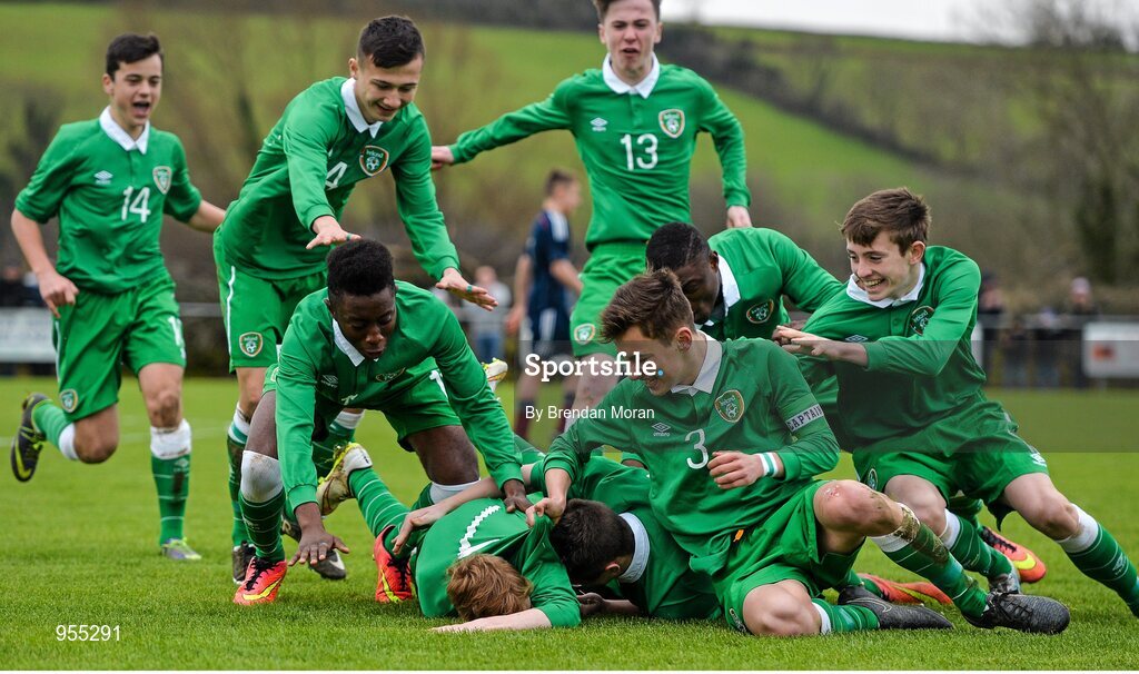 25 January 2015; Glen McAuley, 7, Republic of Ireland, is congratulated by team-mates after scoring his side's first goal with teammates, from left, Sultan Owolabi, Dominic Peppard and Alan McColgan. U15 Soccer International, Republic of Ireland v Scotland, Tanavalla, Listowel, Co. Kerry. Picture credit: Brendan Moran / SPORTSFILE