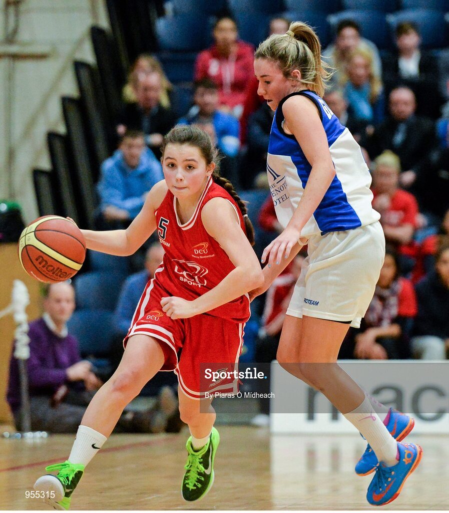 24 January 2015; Anna Brennan, DCU Mercy, in action against Hollie Herlihy, Glanmire BC. Basketball Ireland Women's U18 National Cup Final, DCU Mercy v Glanmire BC, National Basketball Arena, Tallaght, Dublin. Picture credit: Piaras O Midheach / SPORTSFILE