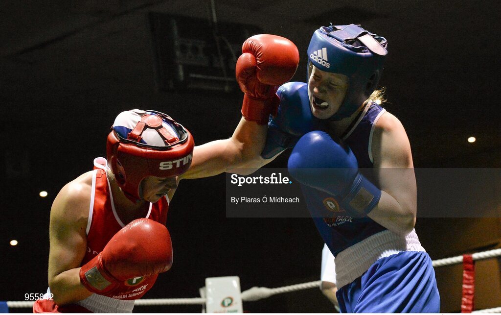 24 January 2015; Louise Donohue, Geesala, Mayo, right, exchanges punches with Debbie O'Reilly, Olympic, Galway, during their 60 kg bout. National Elite Boxing Championship Finals, National Stadium, Dublin. Picture credit: Piaras Ó Mídheach / SPORTSFILE