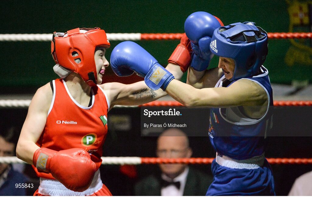24 January 2015; Lauren Hogan, St Brigids Edenderry, left, exchanges punches with Maeve Clarke, Ballinacarrow, during their 48 kg bout. National Elite Boxing Championship Finals, National Stadium, Dublin. Picture credit: Piaras Ó Mídheach / SPORTSFILE