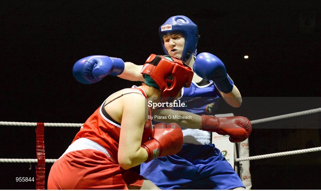 24 January 2015; Clare Grace, Callan, Kilkenny, right, exchanges punches with Christina Desmond, Macroom, Cork, during their 69 kg bout. National Elite Boxing Championship Finals, National Stadium, Dublin. Picture credit: Piaras Ó Mídheach / SPORTSFILE