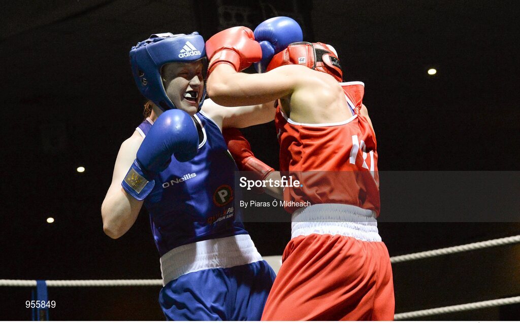 24 January 2015; Louise Donohue, Geesala, Mayo, left, exchanges punches with Debbie O'Reilly, Olympic, Galway, during their 60 kg bout. National Elite Boxing Championship Finals, National Stadium, Dublin. Picture credit: Piaras Ó Mídheach / SPORTSFILE