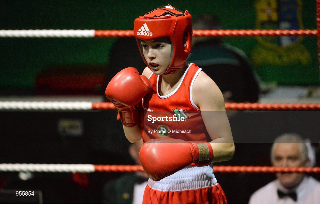 24 January 2015; Lauren Hogan, St Brigids Edenderry, during her 48kg bout with Maeve Clarke, Ballinacarrow. National Elite Boxing Championship Finals, National Stadium, Dublin. Picture credit: Piaras Ó Mídheach / SPORTSFILE