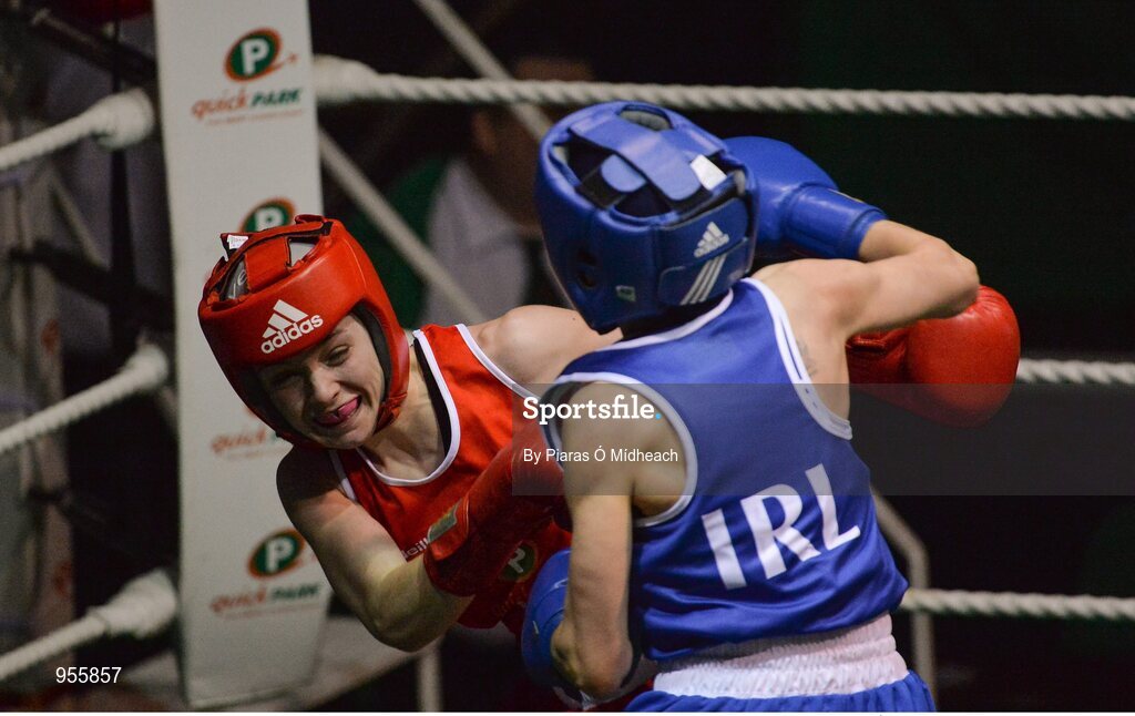 24 January 2015; Lauren Hogan, St Brigids Edenderry, left, exchanges punches with Maeve Clarke, Ballinacarrow, during their 48 kg bout. National Elite Boxing Championship Finals, National Stadium, Dublin. Picture credit: Piaras Ó Mídheach / SPORTSFILE