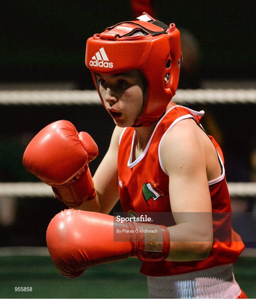 24 January 2015; Lauren Hogan, St Brigids Edenderry, during her 48kg bout with Maeve Clarke, Ballinacarrow. National Elite Boxing Championship Finals, National Stadium, Dublin. Picture credit: Piaras Ó Mídheach / SPORTSFILE