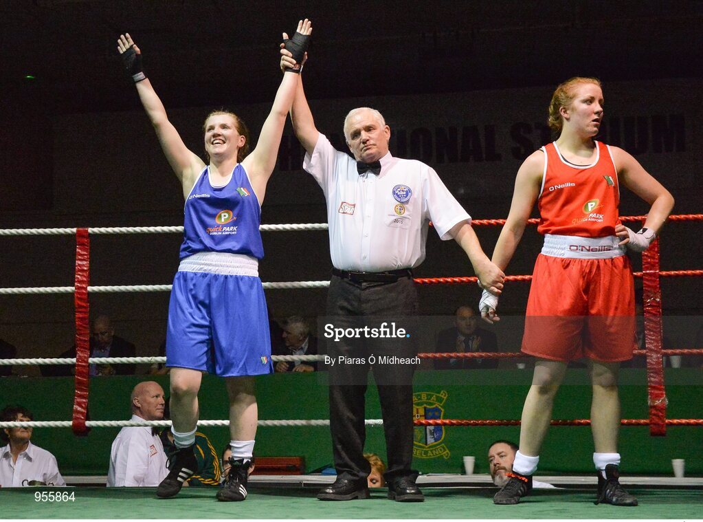 24 January 2015; Clare Grace, Callan, Kilkenny, left, celebrates after being announced winner of her 69kg bout with Christina Desmond, Macroom, Cork. National Elite Boxing Championship Finals, National Stadium, Dublin. Picture credit: Piaras Ó Mídheach / SPORTSFILE