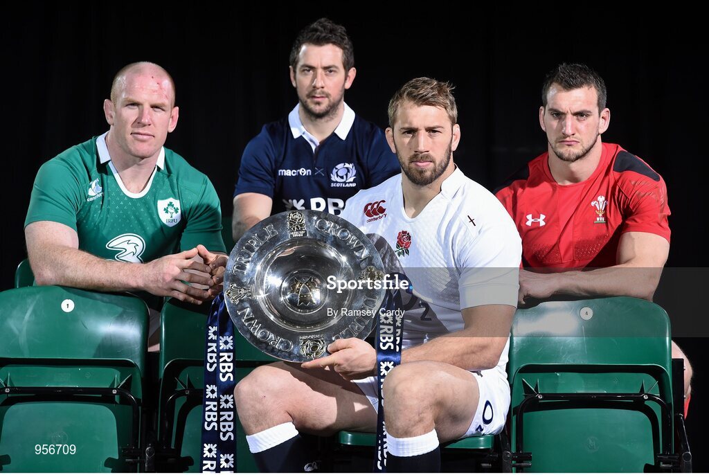 28 January 2015; In attendance at the launch of the RBS Six Nations Championship Launch 2015 are team captains, from left to right, Ireland's Paul O'Connell, Scotland's Greig Laidlaw, England's Chris Robshaw and Wales' Sam Warburton with the Triple Crown Trophy. RBS Six Nations Championship Launch 2015, The Hurlingham Club, Ranelagh Gardens, London, England. Picture credit: Ramsey Cardy / SPORTSFILE