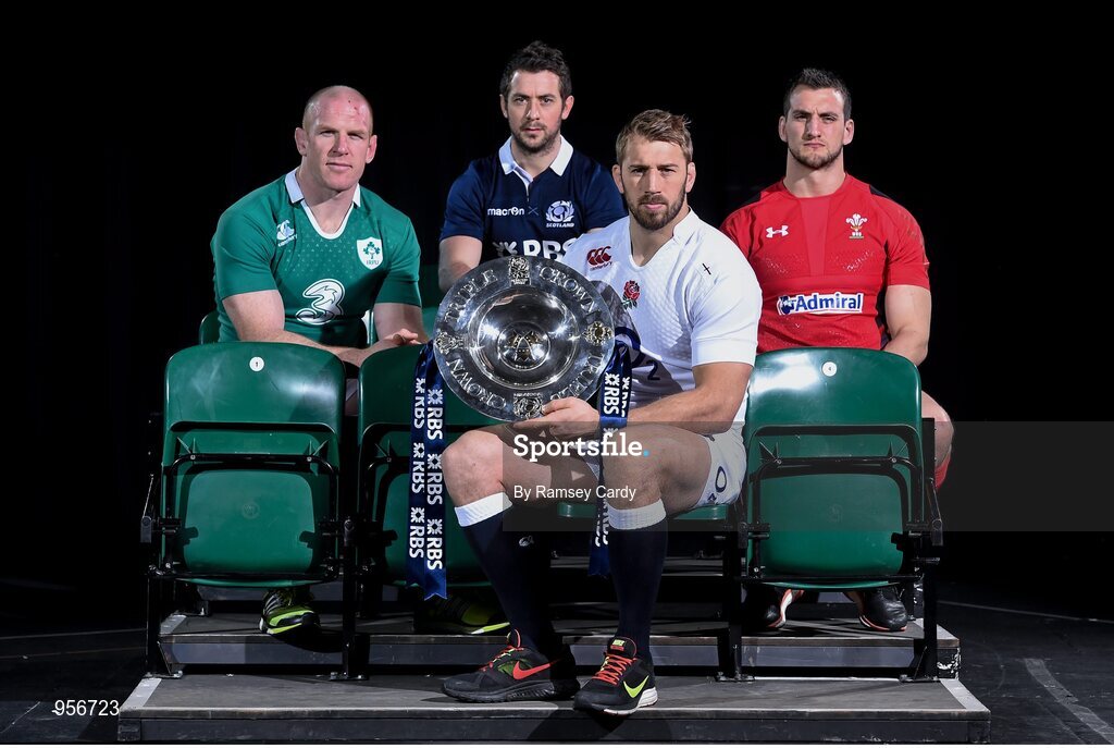 28 January 2015; In attendance at the launch of the RBS Six Nations Championship Launch 2015 are team captains, from left to right, Ireland's Paul O'Connell, Scotland's Greig Laidlaw, England's Chris Robshaw and Wales' Sam Warburton with the Triple Crown Trophy. RBS Six Nations Championship Launch 2015, The Hurlingham Club, Ranelagh Gardens, London, England. Picture credit: Ramsey Cardy / SPORTSFILE