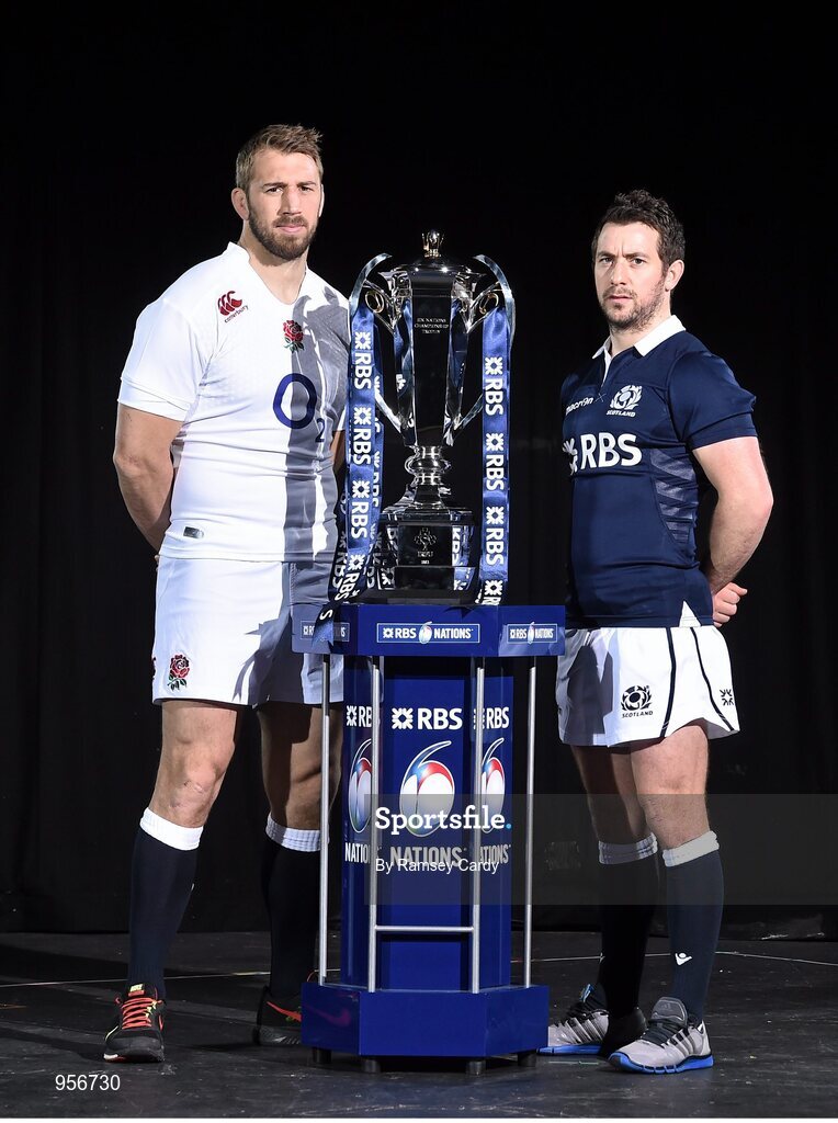 28 January 2015; In attendance at the launch of the RBS Six Nations Championship Launch 2015 are team captains, England's Chris Robshaw, left, and Scotland's Greig Laidlaw. RBS Six Nations Championship Launch 2015, The Hurlingham Club, Ranelagh Gardens, London, England. Picture credit: Ramsey Cardy / SPORTSFILE
