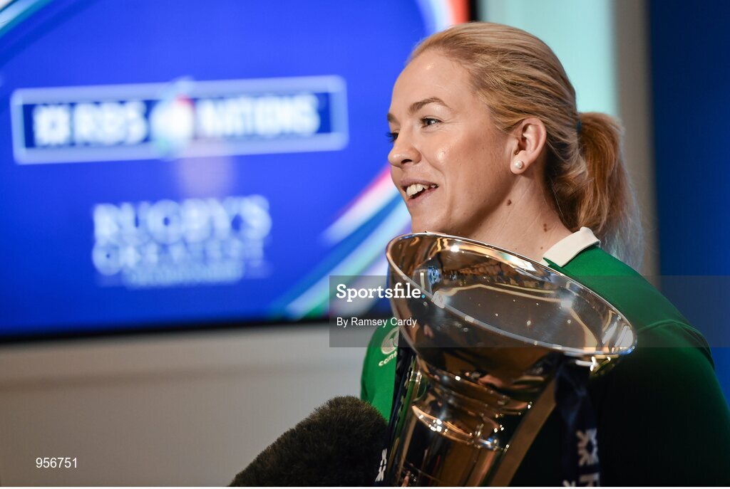 28 January 2015; Ireland's Niamh Briggs speaks to media at the launch of the RBS Six Nations Championship Launch 2015. RBS Six Nations Championship Launch 2015, The Hurlingham Club, Ranelagh Gardens, London, England. Picture credit: Ramsey Cardy / SPORTSFILE