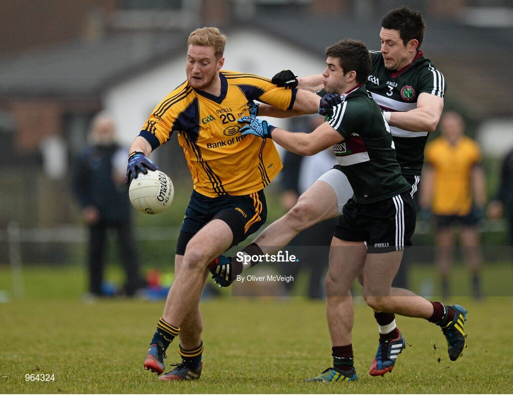 11 February 2015; Conor McGreanor, DCU, in action against Conor Clarke and Paddy McBride, St Mary's College, Belfast. Independent.ie Sigerson Cup, Quarter-Final, St Mary's College, Belfast v DCU. St Genevieves High School, Belfast, Co. Antrim. Picture credit: Oliver McVeigh / SPORTSFILE