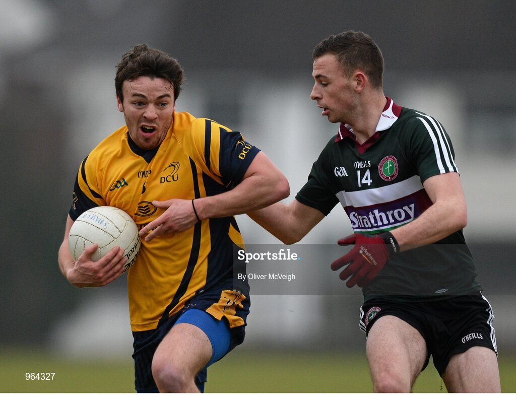 11 February 2015; Conor Moynagh, DCU, in action against Matthew Fitzpatrick, St Mary's College, Belfast. Independent.ie Sigerson Cup, Quarter-Finals, St Mary's College, Belfast V DCU. St Genevieves High School, Belfast, Co. Antrim. Picture credit: Oliver McVeigh / SPORTSFILE