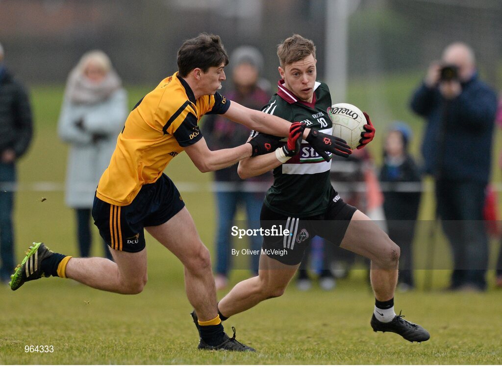 11 February 2015; Jerome Johnston, St Mary's College, Belfast, in action against Jack Smith, DCU. Independent.ie Sigerson Cup, Quarter-Finals, St Mary's College, Belfast V DCU. St Genevieves High School, Belfast, Co. Antrim. Picture credit: Oliver McVeigh / SPORTSFILE
