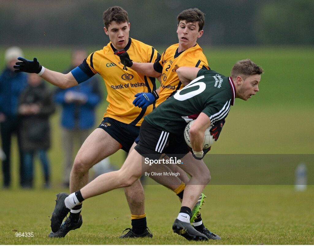 11 February 2015; Jerome Johnston, St Mary's College, Belfast, in action against Conor Daly and Jack Smith, DCU. Independent.ie Sigerson Cup, Quarter-Finals, St Mary's College, Belfast V DCU. St Genevieves High School, Belfast, Co. Antrim. Picture credit: Oliver McVeigh / SPORTSFILE