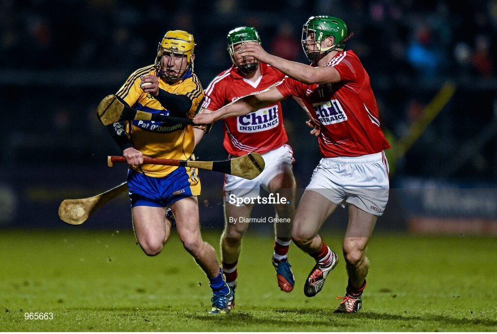 21 February 2015; Colm Galvin, Clare, in action against Seamus Harnedy, right, and Daniel Kearney, Cork. Allianz Hurling League Division 1A, round 2, Cork v Clare, Páirc Uí Rinn, Cork. Picture credit: Diarmuid Greene / SPORTSFILE