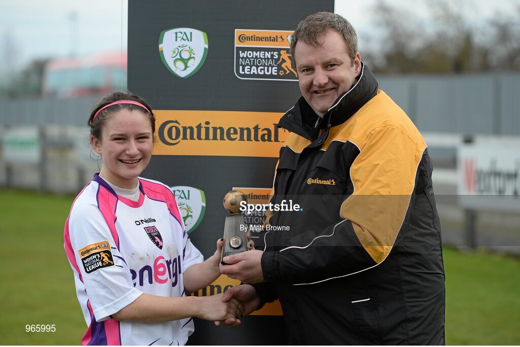 22 February 2015; Aisling Frawley, Wexford Youths is presented with her player of the match trophy by John Hearne from Top Tyres in Ardcavan, Co. Wexford. Continental Tyres Women's National League, Wexford Youths v Raheny United, Ferrycarraig Park, Wexford. Picture credit: Matt Browne / SPORTSFILE