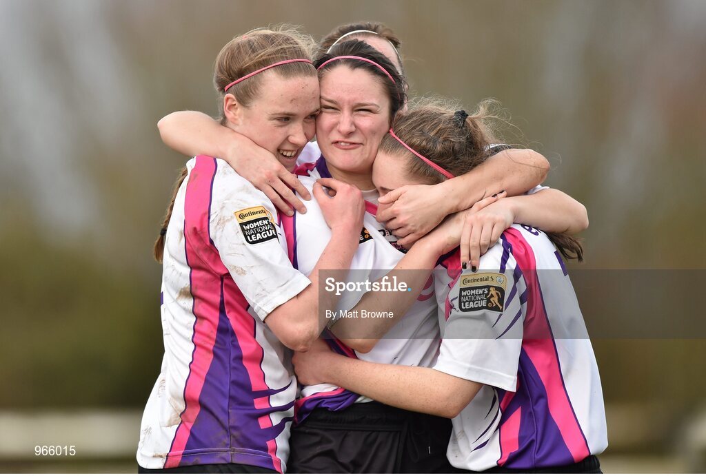 22 February 2015; Aisling Frawley, Wexford Youths, celebrates after scoring her second goal against Raheny United with team-mates Becky Cassin, left, and Claire O'Riordan. Continental Tyres Women's National League, Wexford Youths v Raheny United, Ferrycarraig Park, Wexford. Picture credit: Matt Browne / SPORTSFILE