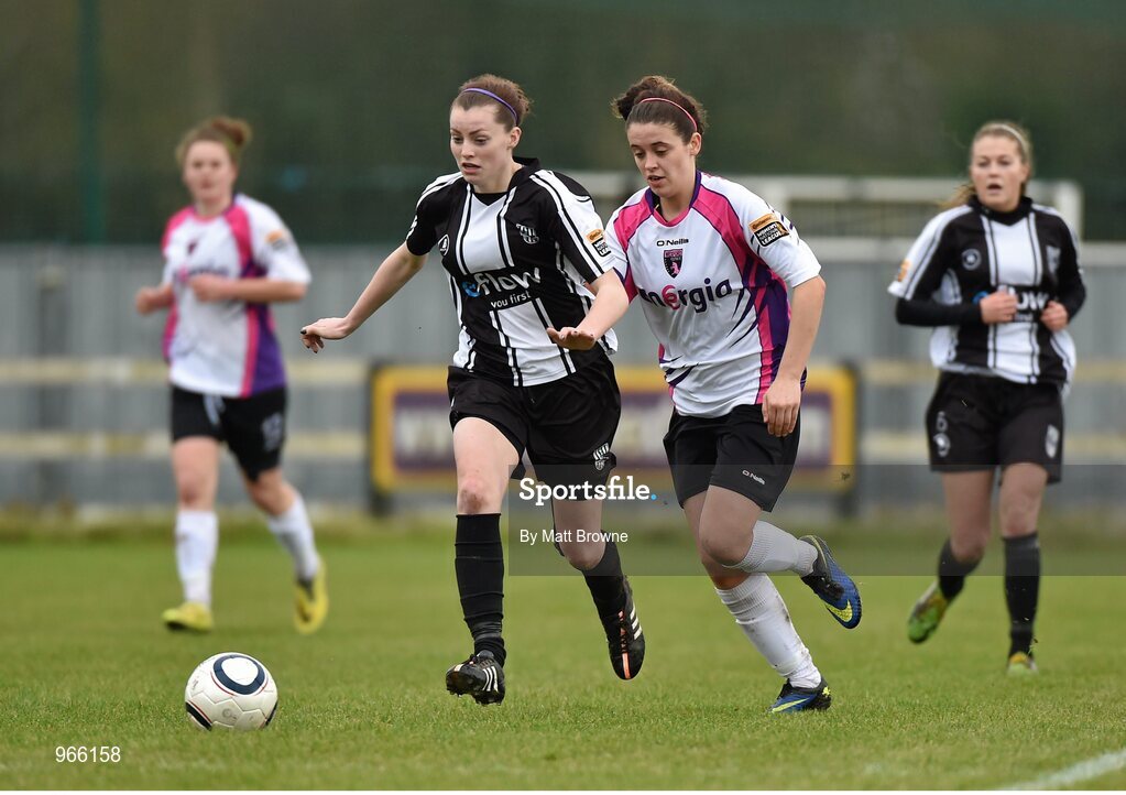 22 February 2015; Lauren Dwyer, Raheny United, in action against Amy Walsh, Wexford Youths. Continental Tyres Women's National League, Wexford Youths v Raheny United, Ferrycarraig Park, Wexford. Picture credit: Matt Browne / SPORTSFILE