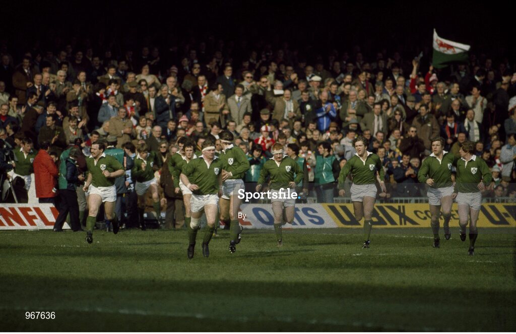 5 March 1983; From left, Moss Keane, Phil Orr, Trevor Ringland, John O'Driscoll, Michael Kiernan, Ciaran Fitzgerald, Donal Lenihan, Gerry "Ginger" McLoughlin, Hugo MacNeill, Fergus Slattery and Ollie Campbell. Ireland Rugby team in action against Wales. Ireland v Wales. Cardiff Arms Park. Ireland 9 Wales 23. Picture credit: SPORTSFILE