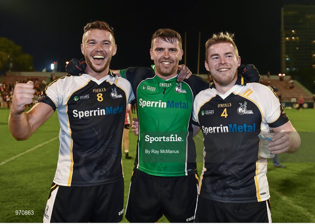7 March 2015; Gavin Murphy, left, goalkeeper James Martin and Peter Domican of the Middle East 2 team celebrate after theit victory over the Middle East 1 team in the GAA World Games Men's final. Zayed Sports Stadium, Abu Dhabi, United Arab Emirates. Picture credit: Ray McManus / SPORTSFILE