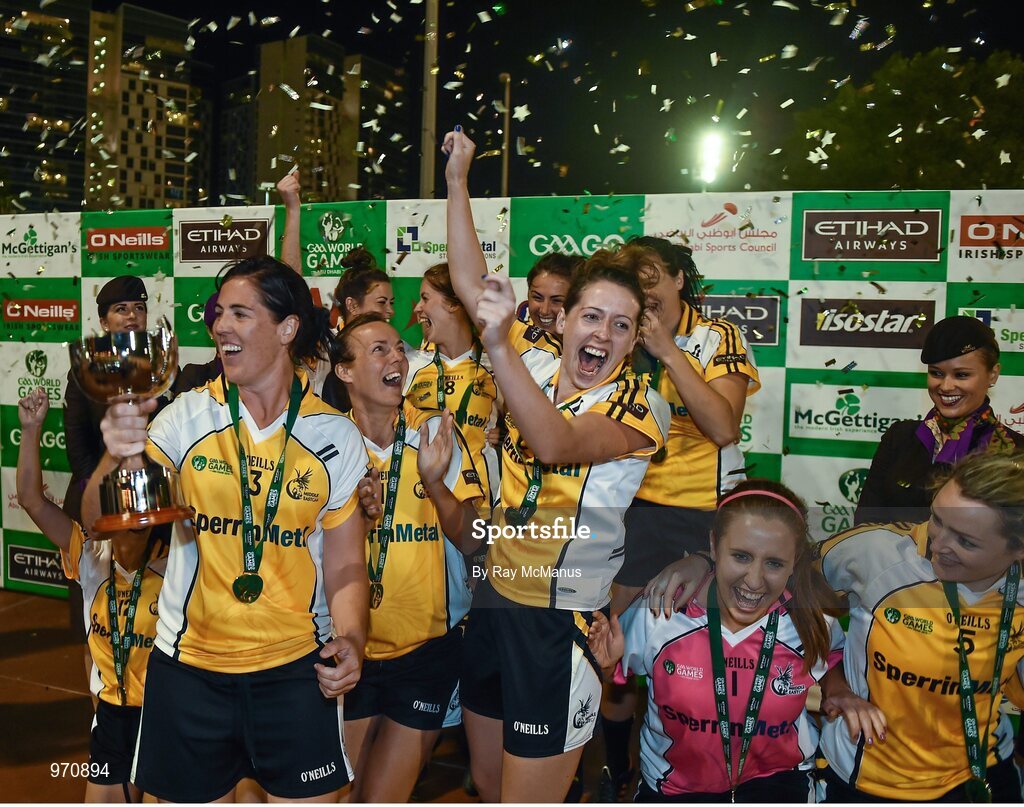 7 March 2015; The Middle East team celebrate after their victory over Australasia in the GAA World Games Women's final. Zayed Sports Stadium, Abu Dhabi, United Arab Emirates. Picture credit: Ray McManus / SPORTSFILE