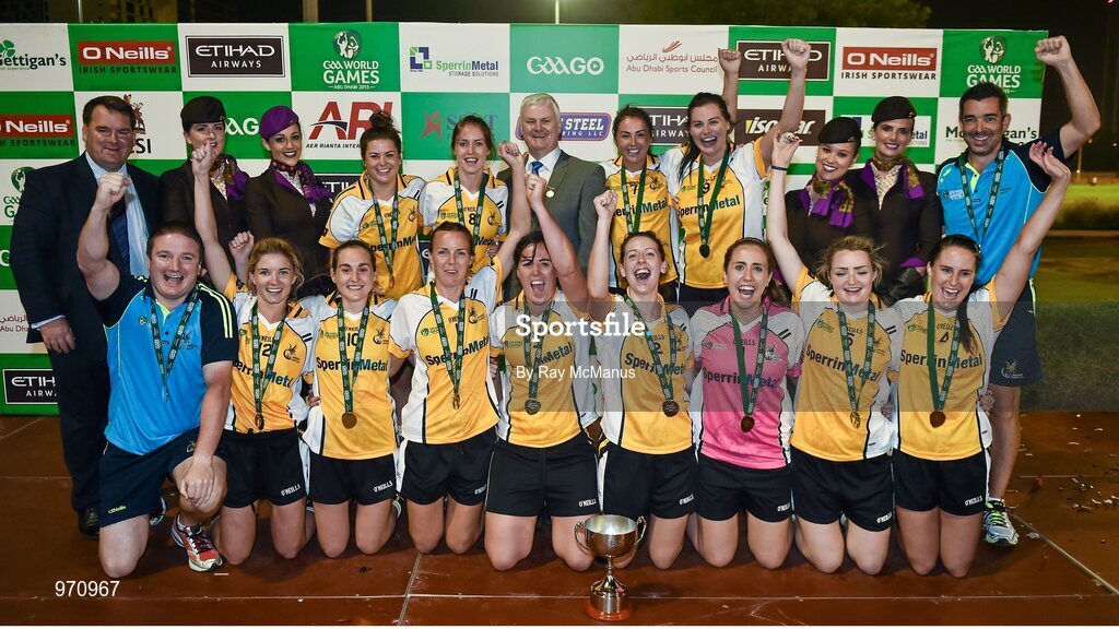 7 March 2015; The Middle East team celebrate after their victory over Australasia in the GAA World Games Women's final. Zayed Sports Stadium, Abu Dhabi, United Arab Emirates. Picture credit: Ray McManus / SPORTSFILE