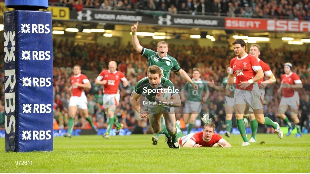21 March 2009; Tommy Bowe, Ireland, goes over for the second try of the game despite the attention of Shane Williams, Wales. RBS Six Nations Championship, Wales v Ireland, Millennium Stadium, Cardiff, Wales. Picture credit: Matt Browne / SPORTSFILE