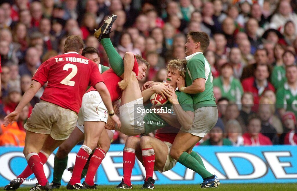 4 February 2007; Andrew Trimble, Ireland, supported by team-mate Ronan O'Gara, right, is tackled by Kevin Morgan, right, Dwayne Peel, centre, and Rhys Thomas, 2, Wales. RBS Six Nations Championship, Wales v Ireland, Millennium Stadium, Cardiff, Wales. Picture credit: Pat Murphy / SPORTSFILE