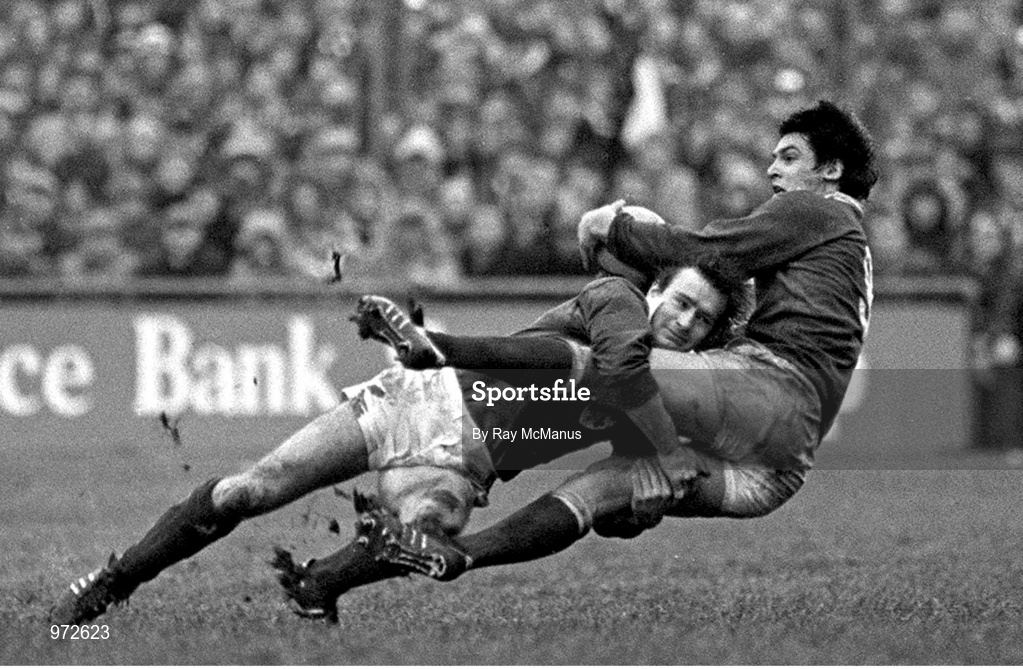 4 February 1984; Mark Douglas, Wales, is tackled by Keith Crossan, Ireland. Five Nations Rugby Championship, Ireland v Wales, Lansdowne Road, Dublin. Picture credit: Ray McManus / SPORTSFILE