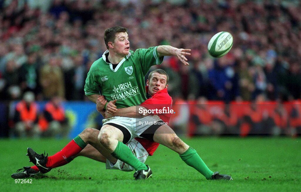 3 February 2002; Brian O'Driscoll, Ireland, releases the ball despite being tackled by Kevin Morgan, Wales. Ireland v Wales, Six Nations Championships, Landsdowne Road, Dublin. Picture credit: Matt Browne / SPORTSFILE