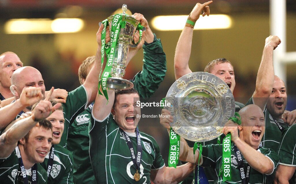 21 March 2009; Ireland captain Brian O'Driscoll and his team-mates celebrate with the Triple Crown trophy and the RBS Six Nations trophy. RBS Six Nations Championship, Wales v Ireland, Millennium Stadium, Cardiff, Wales. Picture credit: Brendan Moran / SPORTSFILE