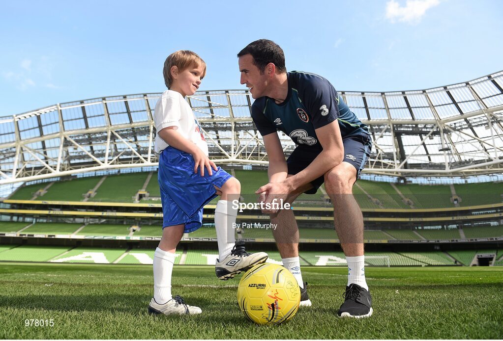 26 March 2015; SportsWorld were delighted to have Republic of Ireland and Sunderland defender John O’Shea, Waterford Utd players Thomas Croke & Patrick Fitzgerald, SportsWorld Managing Director Vivienne Bushell and youth players Ted Healy, Tori Piper, Alex Piper on hand today at the Aviva stadium to launch SportsWorld’s continued sponsorship to Waterford Utd. Pictured at the launch are Republic of Ireland and Sunderland defender John O’Shea, Waterford Utd players Thomas Croke & Patrick Fitzgerald, SportsWorld Managing Director Vivienne Bushell and youth players Ted Healy, Tori Piper, Alex Piper. Aviva Stadium, Lansdowne Road, Dublin. Picture credit: Pat Murphy / SPORTSFILE