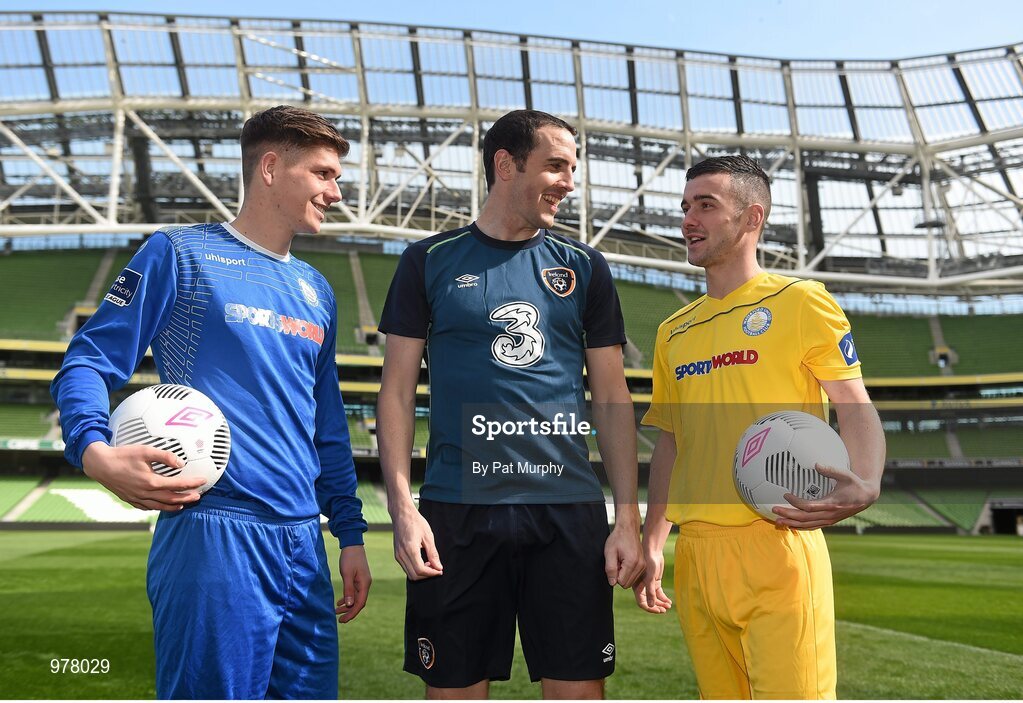 26 March 2015; SportsWorld were delighted to have Republic of Ireland and Sunderland defender John O’Shea, Waterford Utd players Thomas Croke & Patrick Fitzgerald, SportsWorld Managing Director Vivienne Bushell and youth players Ted Healy, Tori Piper, Alex Piper on hand today at the Aviva stadium to launch SportsWorld’s continued sponsorship to Waterford Utd. Pictured at the launch are Republic of Ireland and Sunderland defender John O’Shea, Waterford Utd players Thomas Croke & Patrick Fitzgerald, SportsWorld Managing Director Vivienne Bushell and youth players Ted Healy, Tori Piper, Alex Piper. Aviva Stadium, Lansdowne Road, Dublin. Picture credit: Pat Murphy / SPORTSFILE
