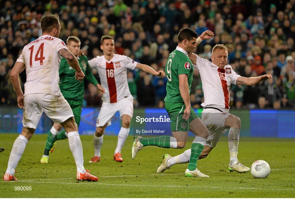 29 March 2015; Shane Long, Republic of Ireland, shoots to score his side's equalsing goal. UEFA EURO 2016 Championship Qualifier, Group D, Republic of Ireland v Poland. Aviva Stadium, Lansdowne Road, Dublin. Picture credit: David Maher / SPORTSFILE