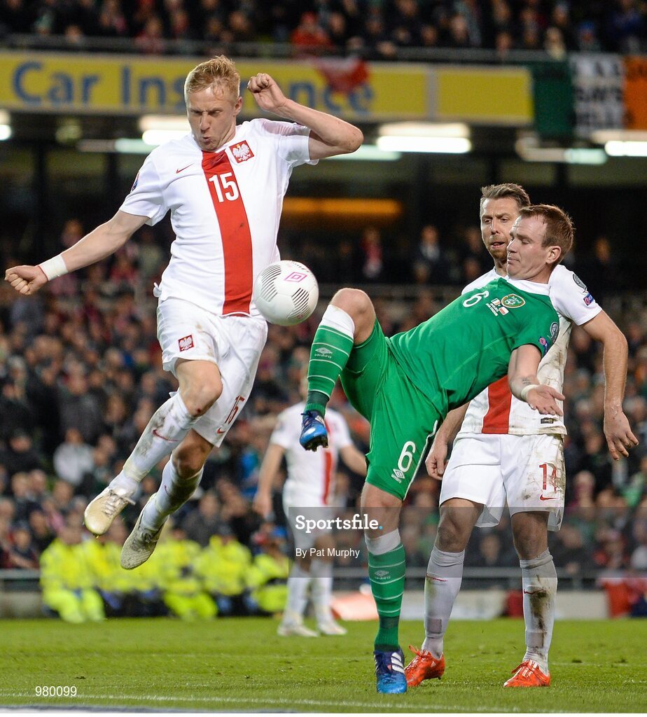 29 March 2015; Glenn Whelan, Republic of Ireland, in action against Kamil Glik, Poland. UEFA EURO 2016 Championship Qualifier, Group D, Republic of Ireland v Poland. Aviva Stadium, Lansdowne Road, Dublin. Picture credit: Pat Murphy / SPORTSFILE