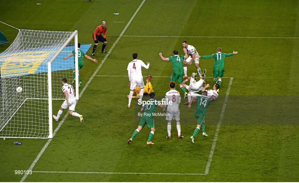 29 March 2015; Republic of Ireland players turn to celebrate after Shane Long, 9, scored their side's equalising goal. UEFA EURO 2016 Championship Qualifier, Group D, Republic of Ireland v Poland. Aviva Stadium, Lansdowne Road, Dublin. Picture credit: Ray McManus / SPORTSFILE
