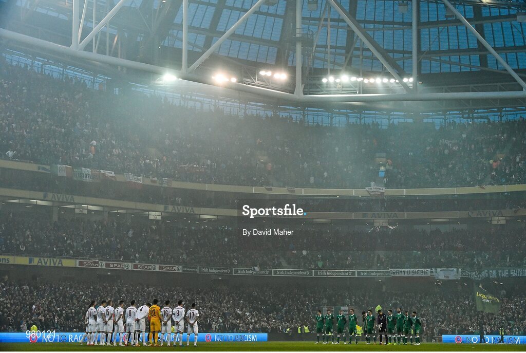 29 March 2015; The two teams stand for a minute silence. UEFA EURO 2016 Championship Qualifier, Group D, Republic of Ireland v Poland. Aviva Stadium, Lansdowne Road, Dublin. Picture credit: David Maher / SPORTSFILE
