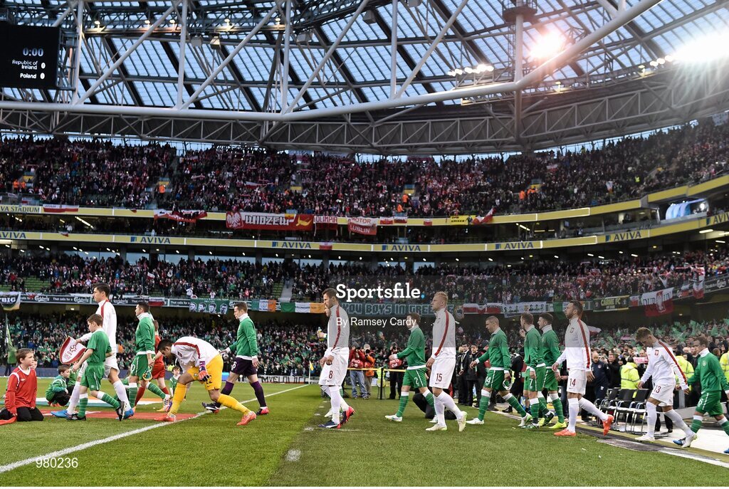 29 March 2015; The teams walk out ahead of the match. UEFA EURO 2016 Championship Qualifier, Group D, Republic of Ireland v Poland. Aviva Stadium, Lansdowne Road, Dublin. Picture credit: Ramsey Cardy / SPORTSFILE