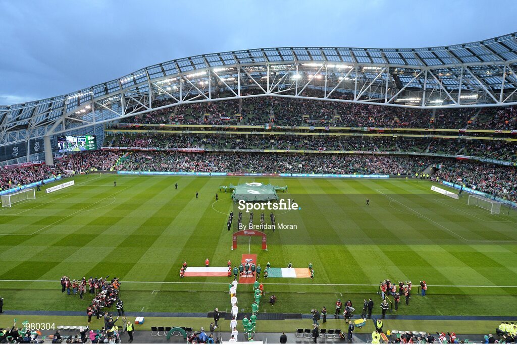 29 March 2015; The Republic of Ireland and Poland teams walk onto the pitch ahead of the game. UEFA EURO 2016 Championship Qualifier, Group D, Republic of Ireland v Poland. Aviva Stadium, Lansdowne Road, Dublin. Picture credit: Brendan Moran / SPORTSFILE