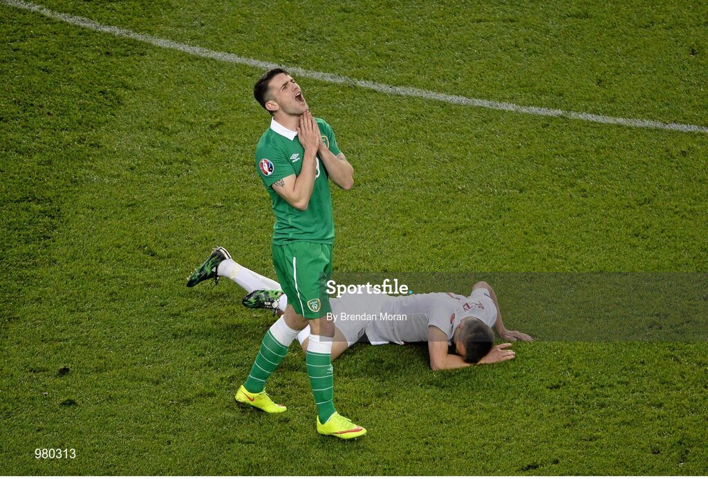 29 March 2015; Robbie Brady, Republic of Ireland, reacts after giving away a free kick for a foul on Slawomir Peszko, Poland. UEFA EURO 2016 Championship Qualifier, Group D, Republic of Ireland v Poland. Aviva Stadium, Lansdowne Road, Dublin. Picture credit: Brendan Moran / SPORTSFILE