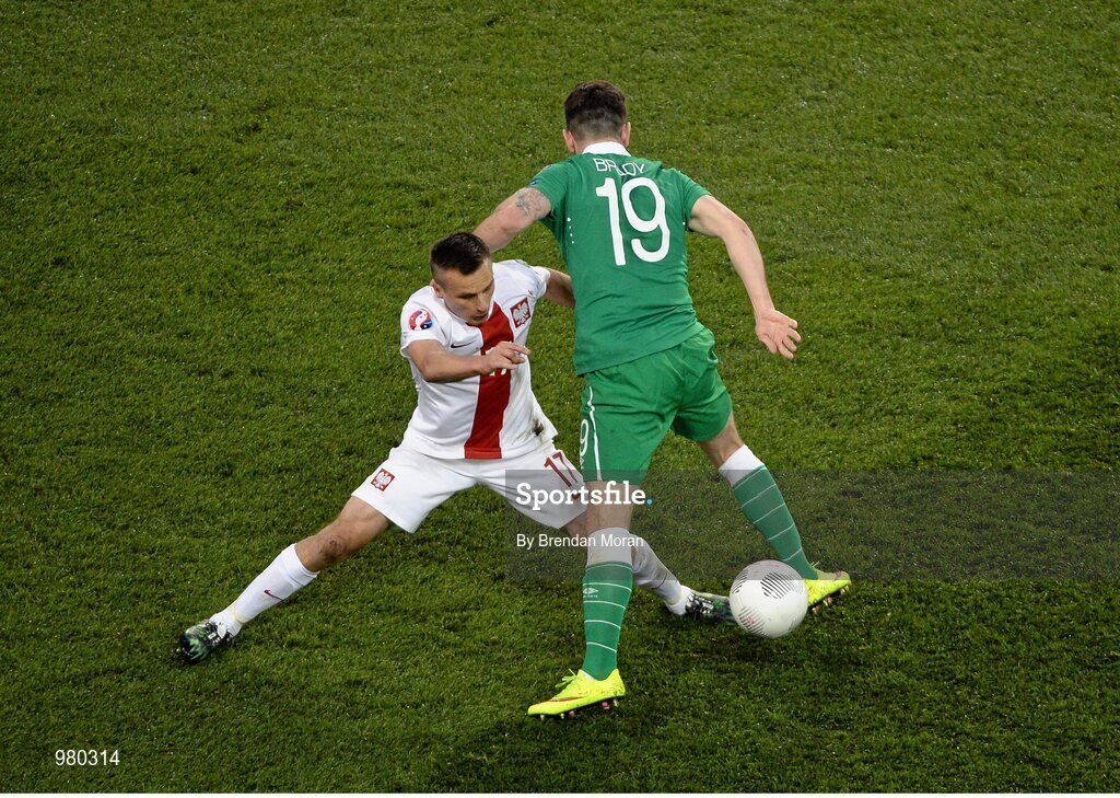 29 March 2015; Robbie Brady, Republic of Ireland, is dispossessed by Slawomir Peszko, Poland. UEFA EURO 2016 Championship Qualifier, Group D, Republic of Ireland v Poland. Aviva Stadium, Lansdowne Road, Dublin. Picture credit: Brendan Moran / SPORTSFILE