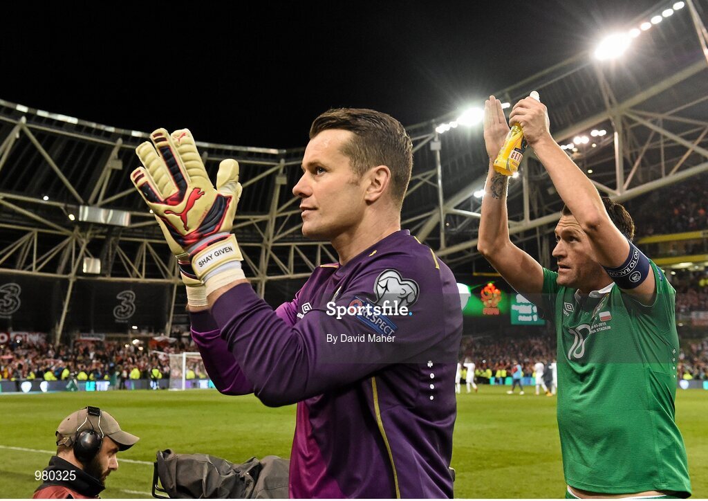 29 March 2015; Shay Given and Robbie Keane, Republic of Ireland, at the end of the game. UEFA EURO 2016 Championship Qualifier, Group D, Republic of Ireland v Poland. Aviva Stadium, Lansdowne Road, Dublin. Picture credit: David Maher / SPORTSFILE