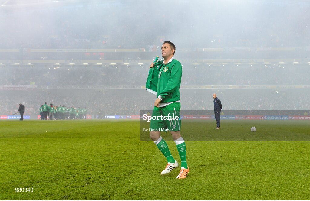 29 March 2015; Robbie Keane, Republic of Ireland, removes his tracksuit top for the official photograph before the start of the game. UEFA EURO 2016 Championship Qualifier, Group D, Republic of Ireland v Poland. Aviva Stadium, Lansdowne Road, Dublin. Picture credit: David Maher / SPORTSFILE