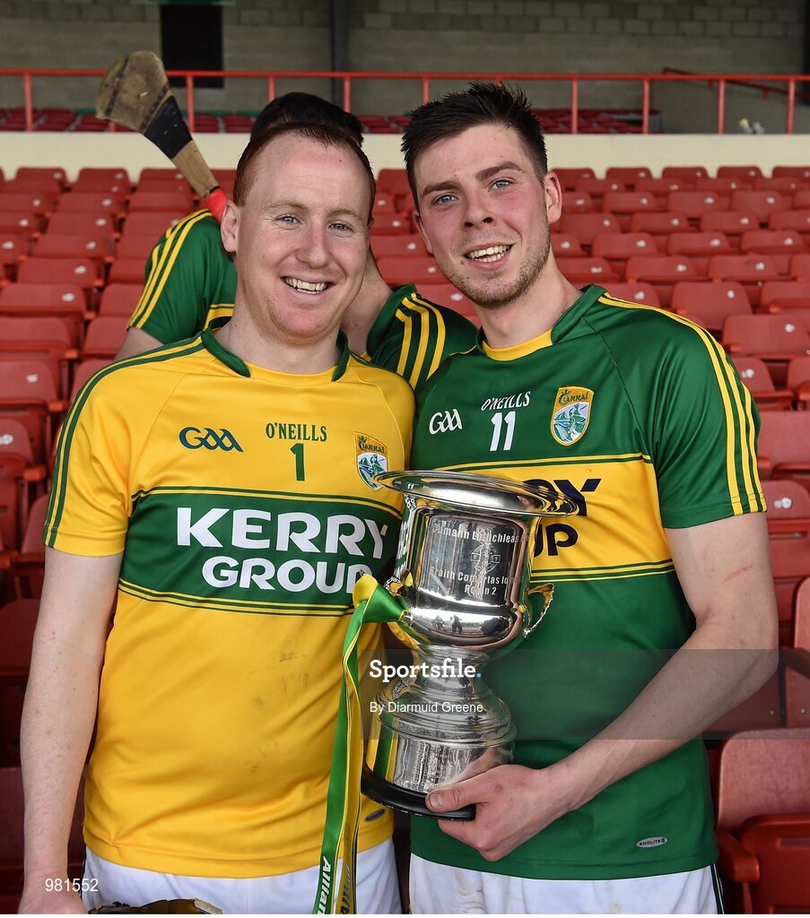 4 April 2015; Kerry players James Logue, left, and Shane Nolan celebrate with the cup after victory over Westmeath. Allianz Hurling League Division 2A Final, Westmeath v Kerry. Gaelic Grounds, Limerick. Picture credit: Diarmuid Greene / SPORTSFILE