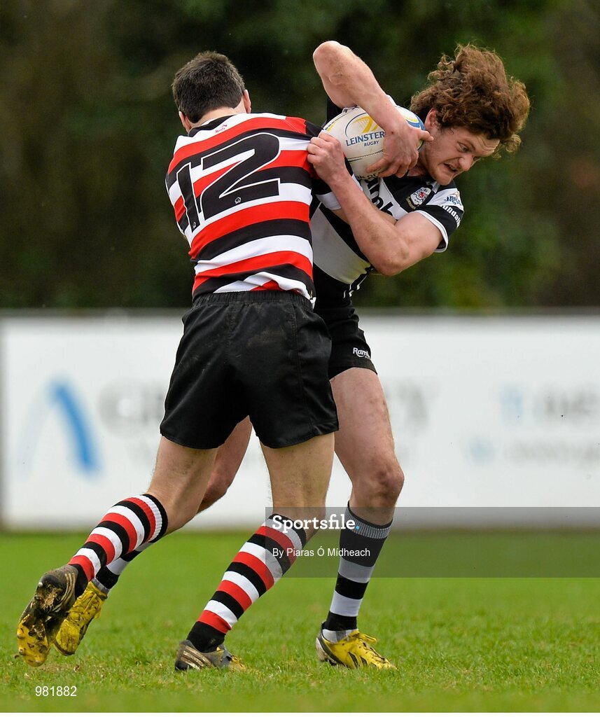 5 April 2015; Jonathan Williams, Dundalk, is tackled by Ivan Poole, Enniscorthy. Bank of Ireland Provincial Towns Cup Semi-Final, Dundalk v Enniscorthy. Naas RFC, Naas, Co. Kildare. Picture credit: Piaras Ó Mídheach / SPORTSFILE